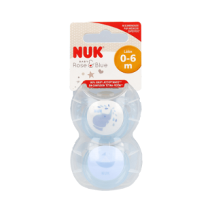Las tetinas de los chupetes Nuk son totalmente anatómicas, ya que se adaptan a la perfección a los movimientos de la boca y de la lengua del bebé. Especialmente ideado para los niños de los 0 a los 6 meses de vida, este modelo de color azul reduce con eficacia la presión de la mandíbula.