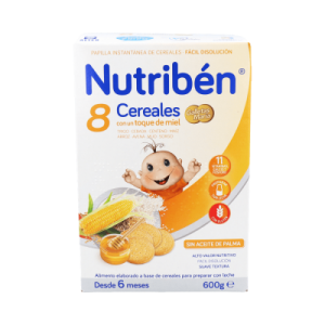 Con el fin de favorecer la digestión del bebé, Nutribén 8 cereales con miel y galletas está elaborada con un total de 8 cereales diversos, que equilibran la alimentación del niño gracias a la nutritiva mezcla de trigo, cebada, centeno, maíz, arroz, avena, mijo y sorgo.