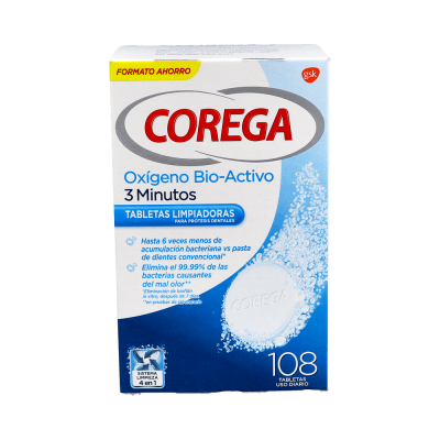 Corega Oxígeno Bio-Activo 3 Minutos Tabletas Limpiadoras 108uds son unas tabletas efervescentes que ayudan a limpiar y proteger la dentadura.