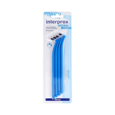 Interprox Access Cónico 4uds es un cepillo interdental especialmente diseñado para eliminar la placa bacteriana acumulada en los espacios inter-proximales de 1,3 mm o sea en la zona entre los molares.