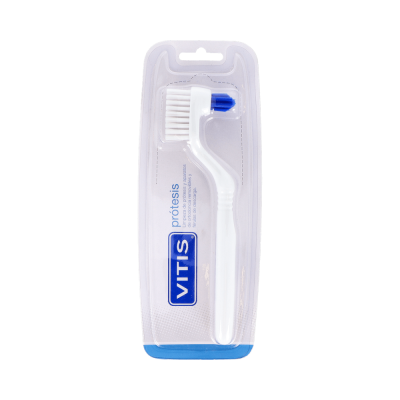 Vitis Prótesis Cepillo es un cepillo dental específicamente preparado para mantener en unas condiciones óptimas de higiene las prótesis, los aparatos de ortodoncia y las férulas. Con dos cabezales especiales, ofrece una limpieza hasta dónde más difícil es limpiar, eliminando los restos de alimentos y de adhesivo acumulado.
