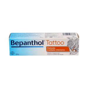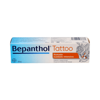 Bepanthol Tattoo Pomada Cuidado Intensivo 30g es una pomada protectora multifuncional que cuida y protege diferentes afecciones cutáneas, entre las que se encuentra un tatuaje. Gracias a sus agentes lipídicos protege y repara e hidrata por su contenido en pantenol, que también contribuye al proceso natural de regeneración.La crema protectora para la piel es fácil de aplicar en una capa fina y no contiene conservantes ni perfume. Es transparente y permite la transpiración de la piel. Elaborada sin perfumes, ni colorantes, ni conservantes