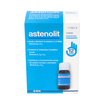Astenolit 12 viales es un complemento alimenticio en formato viales bebibles especialmente indicado para tomar en situaciones de fatiga. Este complemento alimenticio está formulado con vitaminas B1, B6 y B12, ácido aspártico, aminoácidos e inositol que ayudan a disminuir el cansancio y la fatiga.