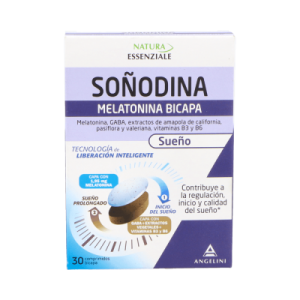 Angelini Natura Soñodina 30 Comprimidos Bicapa es un complemento alimenticio que ayuda a una buena relajación y a mejorar la calidad del sueño. Formulado con ingredientes de origen natural, como melatonina, gaba, extractos de amapola de California, pasiflora y valeriana, así como vitaminas b3 y b6. Este producto contribuye a regular el ciclo del sueño, disminuir el tiempo necesario para conciliar el sueño y aliviar la sensación de desfase horario. Recomendado para adultos a partir de 18 años, su innovadora forma bicapa permite una liberación inteligente de sus ingredientes a lo largo de la noche. Además, es sin gluten, sin lactosa y sin azúcares añadidos. La melatonina ayuda a conciliar el sueño y aliviar el jet lag, la valeriana y la amapola de California mejoran la calidad del sueño, el gaba ayuda al funcionamiento normal del sistema nervioso, y las vitaminas b3 y b6 contribuyen a reducir el cansancio y la fatiga. Se recomienda tomar 1 comprimido media hora antes de acostarse para obtener los beneficios deseados.