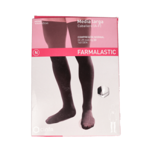 Farmalastic Media Larga Caballero Compresión Normal TG negro está indicado para personas que sufren problemas circulatorios, hinchazones o varices. Asimismo, también son útiles para personas que pasan largos periodos de tiempo de pie y su poder de compresión ayuda a mejorar la circulación sanguínea.Se sujeta con una banda de silicona sin puntilla y tiene un tejido tupido (140 den) y con alto contenido en algodón. . La T-grande tiene aproximadamente un contorno de pantorrilla de 37-39 cm y de tobillo 24-25 cm.*Por motivos de higiene, no se aceptarán cambios ni devoluciones de este producto.
