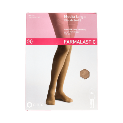 Farmalastic Media Larga Compresión Normal Blonda Beige T-Reina son 2 medias largas de color beige con silicona y blonda (A-F).Proporcionan compresión normal y cuentan con una puntera cerrada.La Talla Reina tiene las medidas 39 - 41 cm, 24 - 25 cm.*Por motivos de higiene, no se aceptarán cambios ni devoluciones de este producto.
