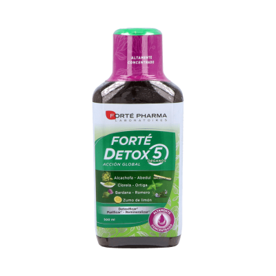 Forté Pharma Forté Detox 5 Órganos 500 ml es un complemento que asocia ingredientes de origen vegetal (alcachofa, limón, abedul, clorela, romero y bardana) para una acción global sobre los 5 órganos principales implicados en los procesos de depuración del cuerpo.