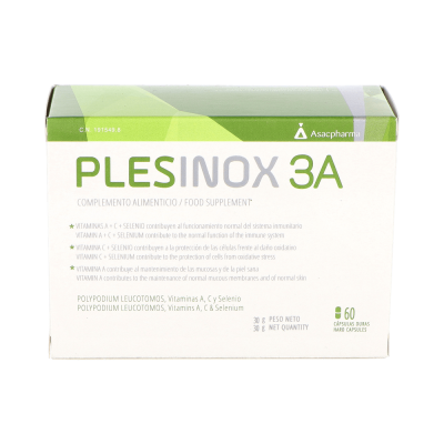 Plesinox 3A 60caps es un complemento alimenticio que ayuda a a mejorar las defensas del organismo. Contribuye al funcionamiento normal del sistema inmunitario, a la protección de las células frente al daño oxidativo y al mantenimiento de la piel y las mucosas sanas, gracias a la acción de las Vitaminas A, C y el Selenio, que forman y regeneran los tejidos.