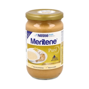 Nestlé Meritene Nutrición Reforzada Puré Pollo con Pasta y Champiñones 300g es un plato principal de fácil ingesta rico en proteínas, vitamina D y Calcio, para el mantenimiento de la salud muscular y ósea.