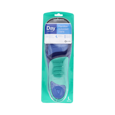 Farmalastic Plantillas Day Actividad Diaria T- L Nº 44-47 plantillas diarias con una estructura de mayor rigidez y diseño anatómico para una mayor estabilidad y apoyo sin perder el confort. Su base está hecha con Gel Thermoplastic Elastomer que absorbe impactos y amortigua. Con un diseño perforado para la transpiración. La suela es de tejido suave y combate todas las bacterias para acabar con malos olores. Talla M 44-47.