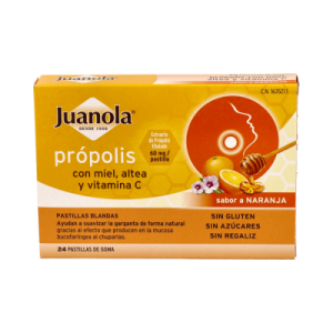 Juanola Própolis Miel Altea y Vitamina C 24uds son pastillas blandas que ayudan a suavizar el tracto respiratorio, gracias a su alto contenido en própolis y miel.