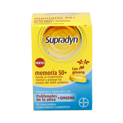 Supradyn Memory 50+ 30comp es un complemento alimenticio especialmente recomendado para las personas a partir de los 50 años, con vitaminas que ayudan a un rendimiento mental en condiciones normales. Fórmula completa con 12 vitaminas, 9 minerales y oligoelementos, polifenoles de la oliva con potente acción antioxidante para las células cerebrales, y ginseng. Recomendado para ayudar al mantenimiento de la memoria y la concentración al incrementar el aporte de oxígeno y nutrientes al cerebro. Para adultos y específicamente recomendado para mayores de 50 años.