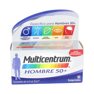 Multicentrum Hombre 50+ 90comp es un complemento alimenticio que proporciona un aporte nutricional correcto de vitaminas y minerales para cubrir las necesidades específicas de los hombres mayores de 50 años.