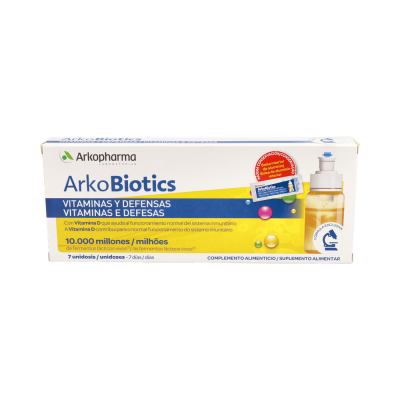 Arkopharma ArkoBiotics Vitaminas y Defensas Adultos 7uds es un complemento alimenticio a base de 5 fermentos lácticos vivos, vitaminas A, B2, B3, B5, B6, B12, C, D y Zinc, que ayuda al funcionamiento normal del sistema inmunitario, a la vez que aporta energía extra en épocas de agotamiento o cansancio.