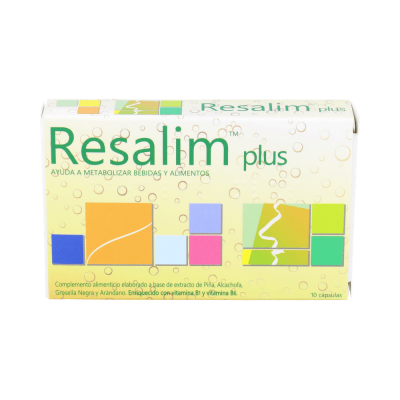 Resalim Plus 10caps es un complemento alimenticio elaborado con extractos vegetales de piña, alcachofa, grosella negra y arándano, que ayuda a metabolizar bebidas y alimentos después de una gran ingesta.